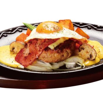 「冬のハッピーバーグ~カルボナーラソース~」は、たっぷりモッツァレラチーズが詰まったジューシーなハンバーグに、ゴーダチーズ、カリカリベーコン、がトッピングされ、ブラウンマッシュルーム入りのカルボナーラソースで絡められています。さらに、ぷるぷるとした目玉焼きがトッピングされ、一層の美味しさを引き立てています。