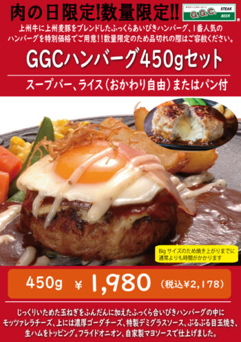 1番人気のGGCハンバーグが なんと!!450g→特別価格 ¥1,980(税込¥2,178)!!