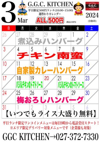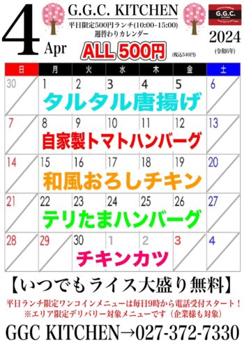 昨今の原材料、水光熱費、ガソリン代などの値上がりに伴い、2024年4月1日(月)よりデリバリー配達料金が3,000円(税込)以上に変更、ランチサービスは終了となります。ご迷惑をおかけして本当に申し訳ございませんが、何卒ご理解下さりますようお願いいたします。