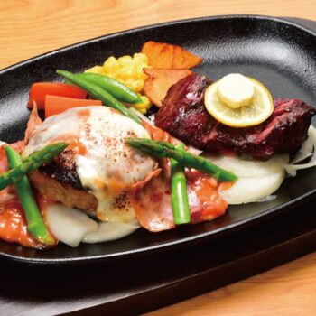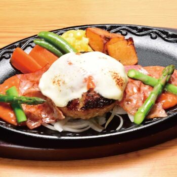 上州牛と上州麦豚をつかったふっくらあいびきハンバーグ180gの中にモッツァレラチーズ。手作りのトマトクリームソースにアスパラガス、カリッと焼き上げたベーコン、花畑牧場のモッツァレラチーズをトッピング。