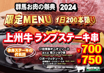 さらにオーナー一押し!!群馬お肉の祭典2024限定 1日200本限り「上州牛ランプステーキ串」を販売します!!