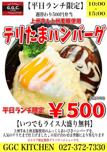 【テリたまハンバーグ弁当】2024年4月22日(月)から4月26日(金)平日限定ワンコインランチ/GGCキッチン