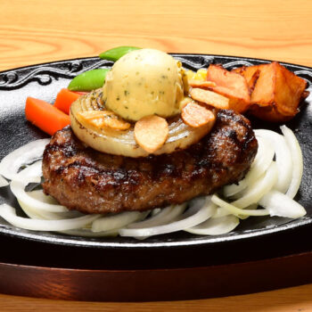 ジューシーな上州牛ハンバーグに、甘みと旨味が凝縮された新玉ねぎとガーリックバターをたっぷりトッピング。さらにガーリックチップで香ばしさをプラスしました。