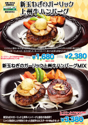 2024年5月、GGC前橋小相木店、前橋駒形店のおすすめメニューは「新玉ねぎのガーリック上州牛ハンバーグ」