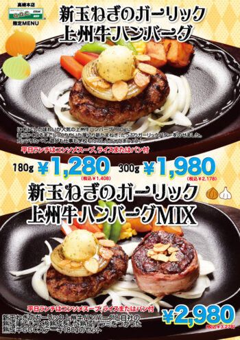 2024年5月のおすすめメニュー「新玉ねぎのガーリック上州牛ハンバーグ」「新玉ねぎのガーリック上州牛ハンバーグMIX」も対象です♪