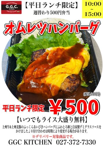 【オムレツハンバーグ弁当】2024年5月20日(月)から5月24日(金)平日限定ワンコインランチ/GGCキッチン