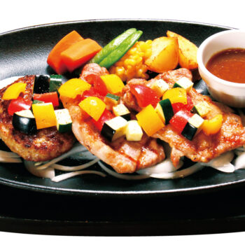 群馬県産のブランド牛「上州牛」と、群馬県産の豚肉「上州麦豚」を絶妙なバランスでブレンドしたハンバーグと上州麦豚の旨みと、群馬県産のブランド鶏「上州高原鶏」の柔らかな食感が織りなす、贅沢な一品。
