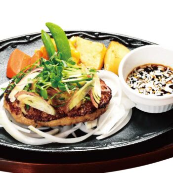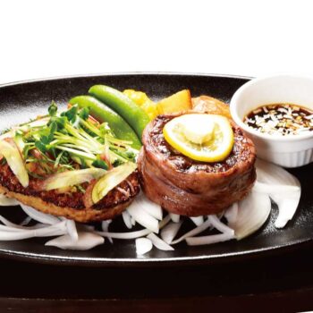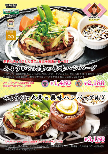 ハンバーグもステーキも食べたいという方には、みょうがと大葉の薬味ハンバーグ&テレビ東京 有吉木曜バラエティーで紹介された熟成牛GGCステーキのコンビ。