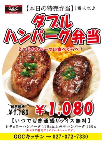 今週は平日ディナータイム(15:00~21:00)限定で、上州牛の味を楽しめるダブルハンバーグ弁当を特別価格で販売しています!