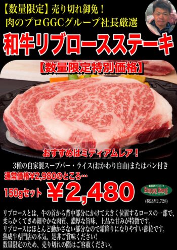 今月は肉の日特別メニュー!30食限定「和牛リブロースステーキ」をご用意♪