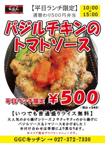 【バジルチキンのトマトソース弁当】2024年6月10日(月)から6月14日(金)平日限定ワンコインランチ/GGCキッチン