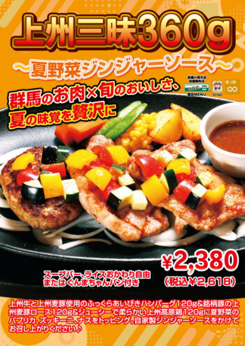 7月のおすすめ「上州三昧360gセット」スープバー、ライスまたはぐんまちゃんパン付 ¥2,380(税込¥2,618)も対象です。