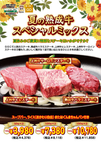 8月のおすすめ「夏の熟成牛スペシャルミックス」も対象です。自社の熟成牛庫でじっくりと熟成をかけて上州牛ヒレステーキ、上州牛サーロインステーキ、塾成牛ハラミステーキの贅沢たべくらべセット。