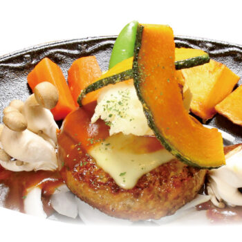 このハンバーグには、群馬県産の上州牛と上州麦豚を使ったとってもジューシーなハンバーグ。中にはモッツァレラチーズ、さらに上にはゴーダチーズがのせています。そして、自家製デミグラスソースとマッシュポテトで、秋の訪れを感じさせる優しい味わいに仕上げました。