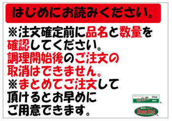お客様にご注文いただいた内容を正確にお届けするために、ご注文確定前に品名と数量を再度ご確認ください。ご確認いただけることで、よりスムーズに料理をお届けできます。 - 調理開始後のキャンセルはご遠慮ください