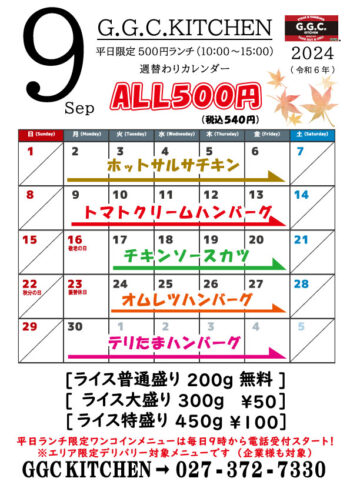 平日限定おすすめワンコインランチ!9月のカレンダー/GGCキッチン