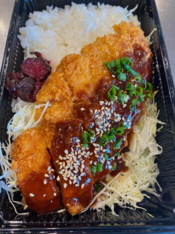 カリッと揚げたチキンカツに、甘辛ソースをたっぷりかけた、ボリューム満点の一品。さらに、ライスは200g!お腹いっぱい食べたい方には+50円で300gに変更可能です。