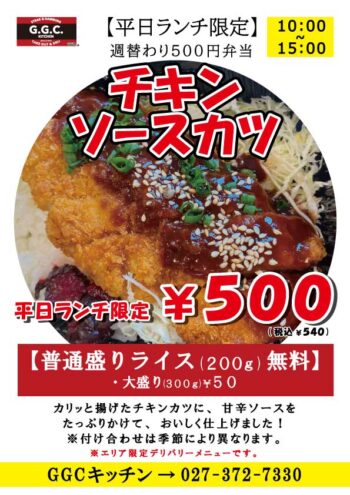 【チキンソースカツ弁当】2024年9月17日(火)から9月20日(金)平日限定ワンコインランチ/GGCキッチン