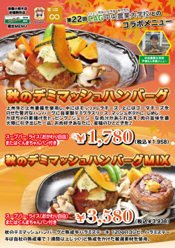 9月のおすすめ中央農業大学校とのコラボメニュー「秋のデミマッシュハンバーグ」「秋のデミマッシュハンバーグMIX」も対象です。