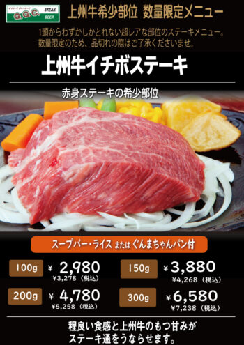 GGC前橋小相木店では 数量限定の「上州牛イチボステーキ」をご用意しました。 上州牛の中でも希少な部位である「イチボ」は、程よい食感と濃厚な旨味が特徴。 赤身ステーキファンにはぜひ一品です!