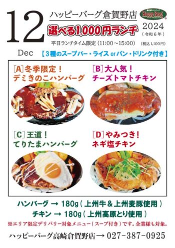 12月の平日ランチタイム限定で、ハッピーバーグ倉賀野店からお得な「選べる1,000円ランチ」(税込1,100円)!