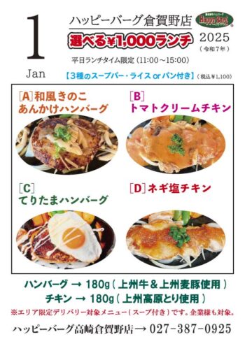 2025年1月の平日ランチタイム限定、ハッピーバーグ倉賀野店のお得な「選べる¥1,000ランチ」(税込¥1,100)!
