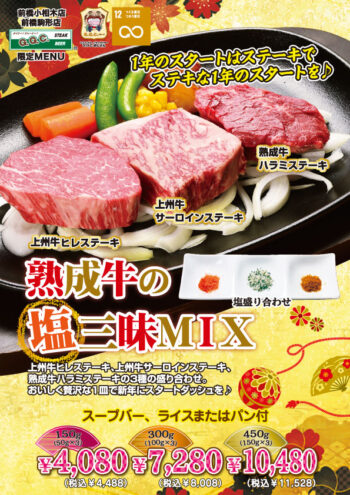 1月のおすすめメニュー「熟成牛の塩三昧MIX」も対象です。