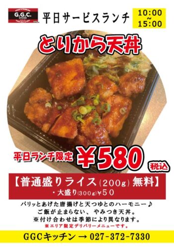 今回は平日開催なので、平日サービスラン「とりから天丼」も対象です。