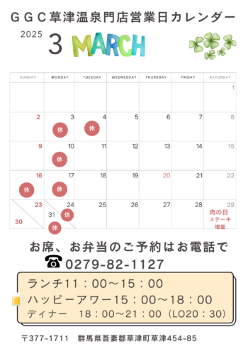 3月の営業カレンダー【GGC草津温泉門店】群馬県/肉料理