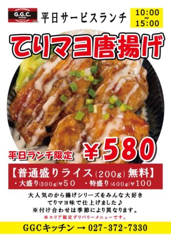 お得な580円ランチ!テリマヨ唐揚げで午後も元気にスタート!平日サービスランチ/GGCキッチン
