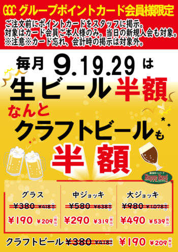 毎月9のつく日は生ビール半額♪も対象です。→GGCグループポイントカード会員様限定サービスです。当日入会も対象です。ご本人様のみが対象。カード忘れ、会計時の掲示は対象外となりますのでご注意ください。