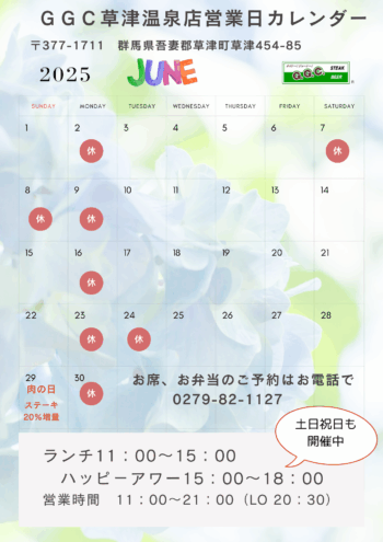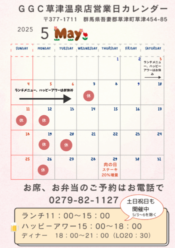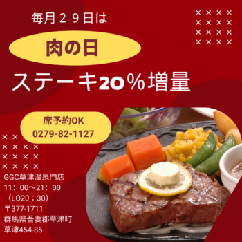 2025年5月29日(木)は草津温泉で味わう地元グルメ!肉の日限定の贅沢チャンス【GGC草津温泉門店】ゴールデンウィーク
