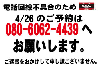 電話が不調のため、4月26日のご予約は080-6062-4439までお電話ください。