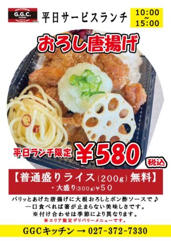 お得な580円ランチ!!「おろし唐揚げ弁当」弁当!平日サービスランチ/GGCキッチン