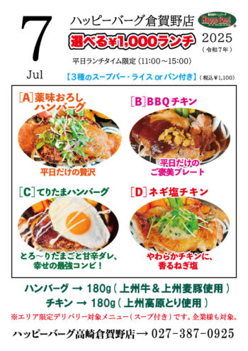 ハッピーバーグ高崎倉賀野店の平日限定!選べる¥1,000ランチ(7月)
