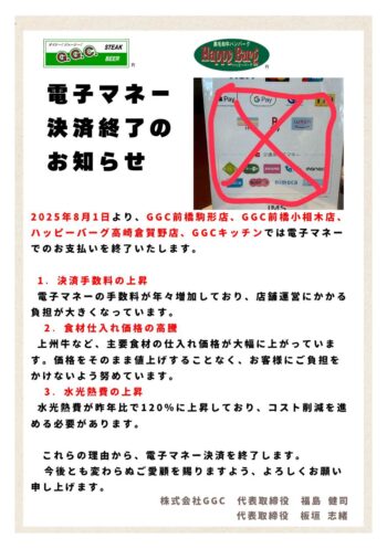 2025年8月1日より、GGC前橋小相木店、GGC前橋駒形店、ハッピーバーグ高崎倉賀店、でGGCキッチンでは電子マネーでのお支払いを終了いたします。