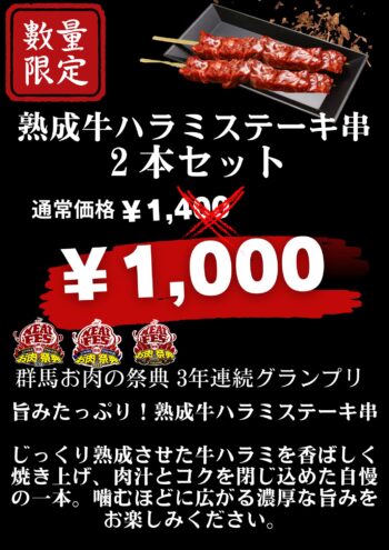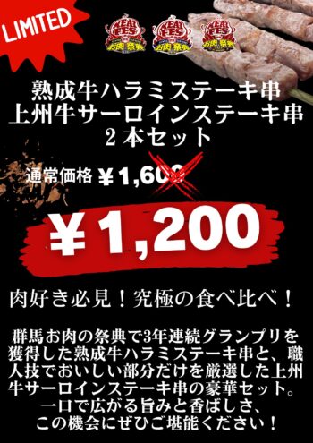群馬お肉の祭典で3年連続グランプリを獲得した大人気商品「熟成牛ハラミステーキ串」と、職人の目利きで厳選した旨味あふれる「上州牛サーロインステーキ串」が、今だけ特別価格でお楽しみいただけます。