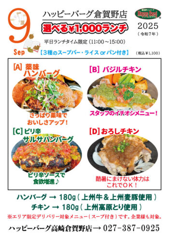 【9月限定】ハッピーバーグ高崎倉賀野店 平日サービスランチ!