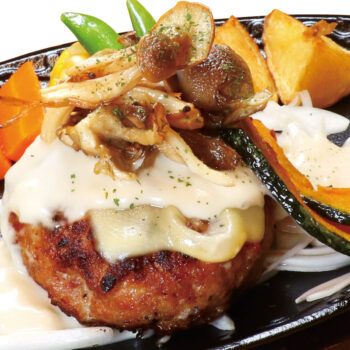 群馬県産の上州牛と上州麦豚を使用したふっくらジューシーな合挽きハンバーグに、とろけるモッツァレラチーズを包み込み、上からはコク深いゴーダチーズを贅沢にトッピング。