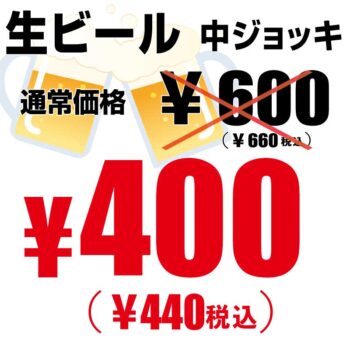 ・生ビール(中ジョッキ) 通常600円 → 400円(税込440円)